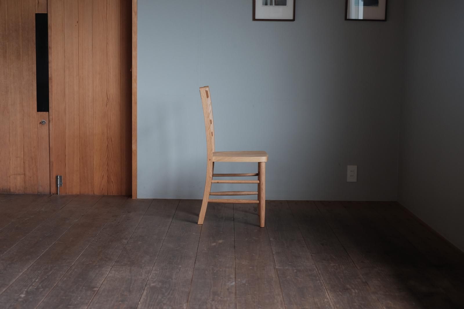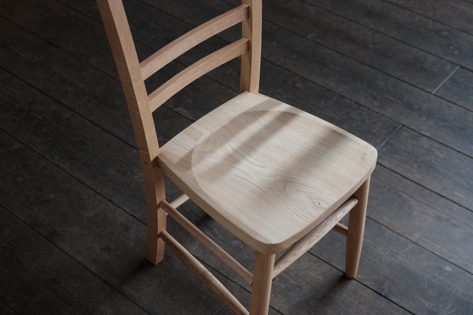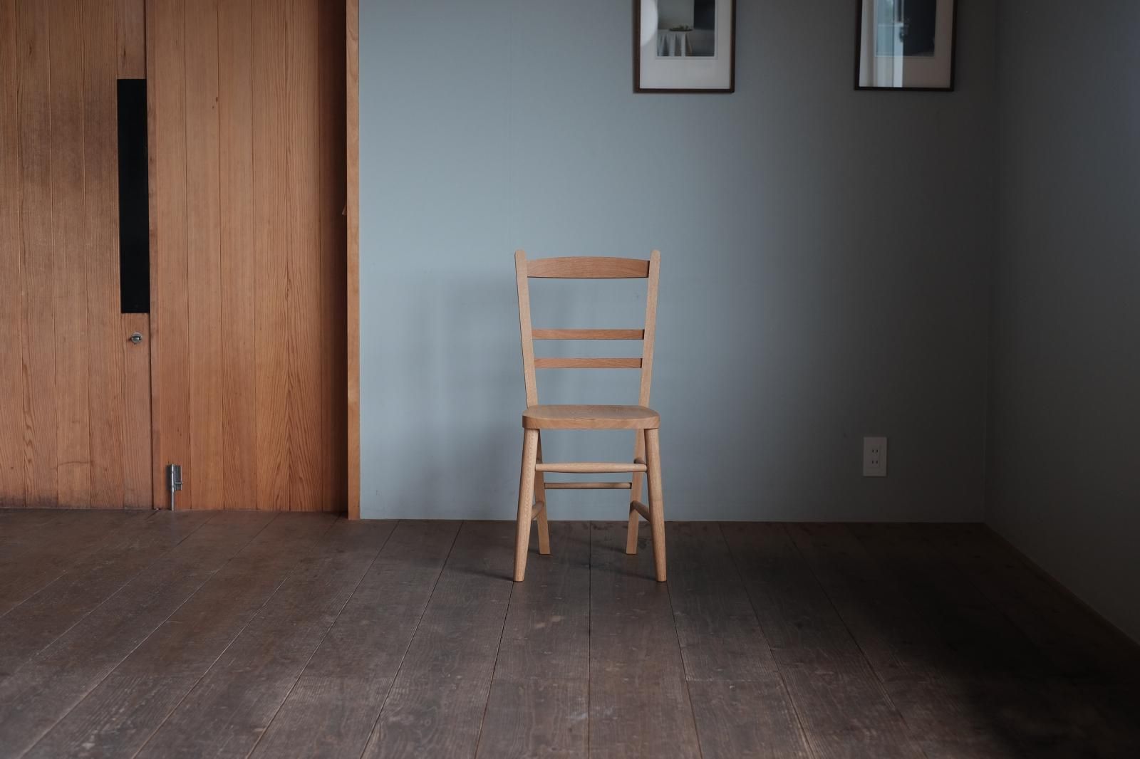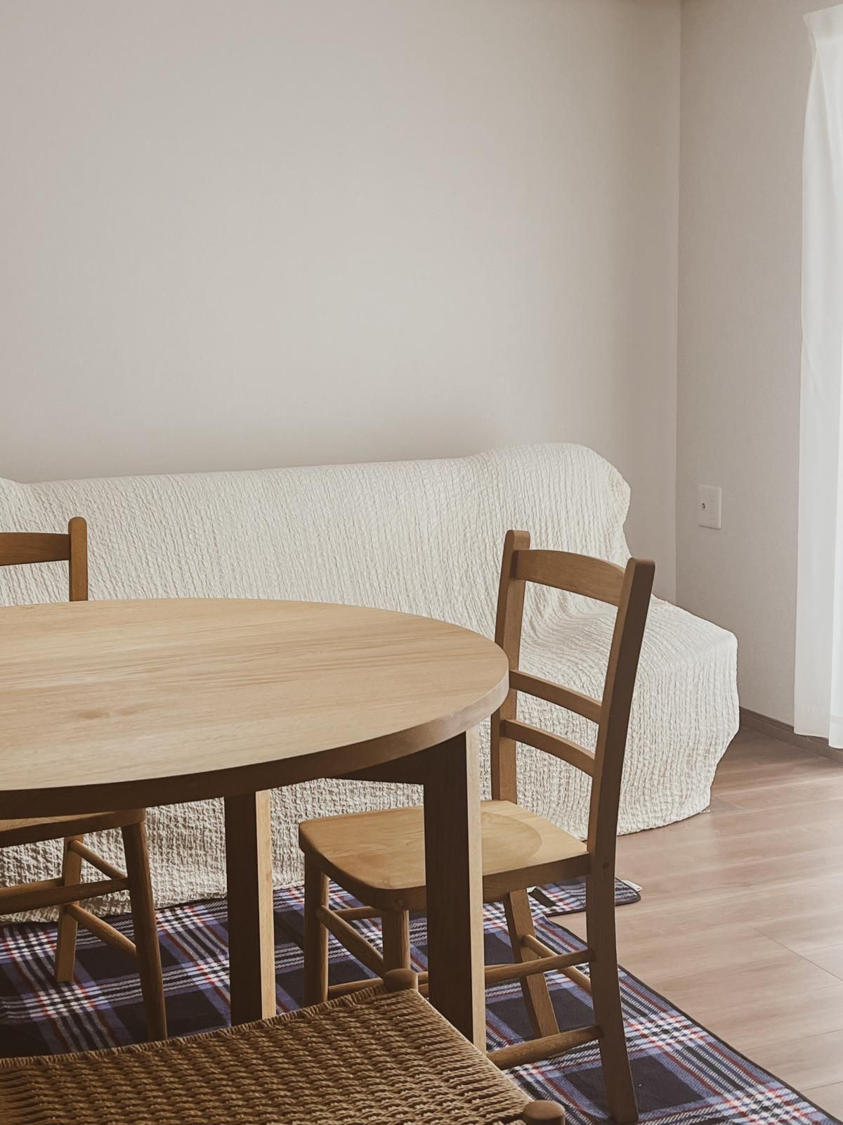 まるテーブルとチャーチチェア、そしてペーパーコードのスツールのダイニングセット。